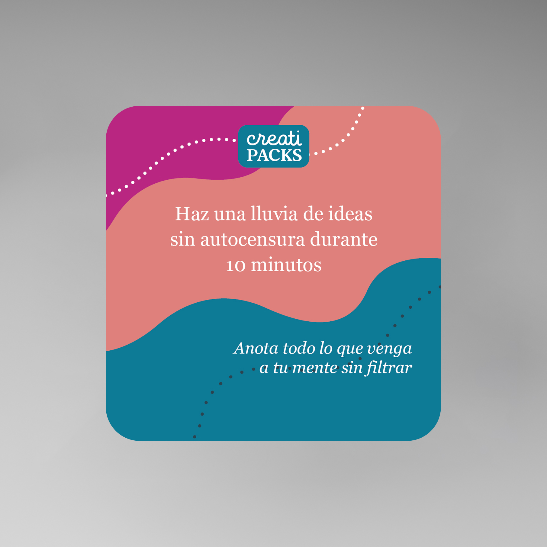 Este pack incluye 40 tarjetas cuidadosamente diseñadas para ayudarte a destrabar tu creatividad en cualquier momento y lugar. Cada CreatiPack es un disparador distinto, pensado para desafiar tu forma de pensar, salir del piloto automático y descubrir nuevas miradas sobre tu trabajo o tus proyectos personales.